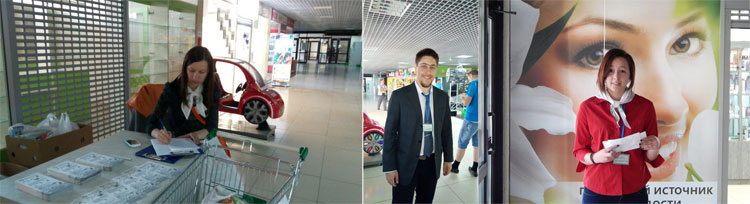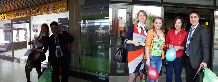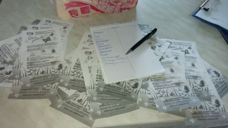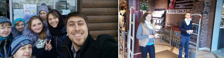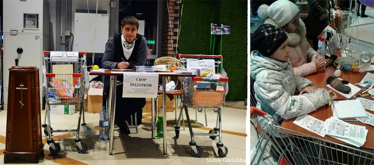 Волонтер раздает листовки об акции со списком собираемых подарков для детей с инвалидностью на входе в магазин. На выходе волонтер собирает подарки в корзину и принимает записки о здравии жертвователей, имена которых будут поминаться в храме в честь святого благоверного Александра Невского (Слуцк, улица Виленская, 59а) на специальном молебне.