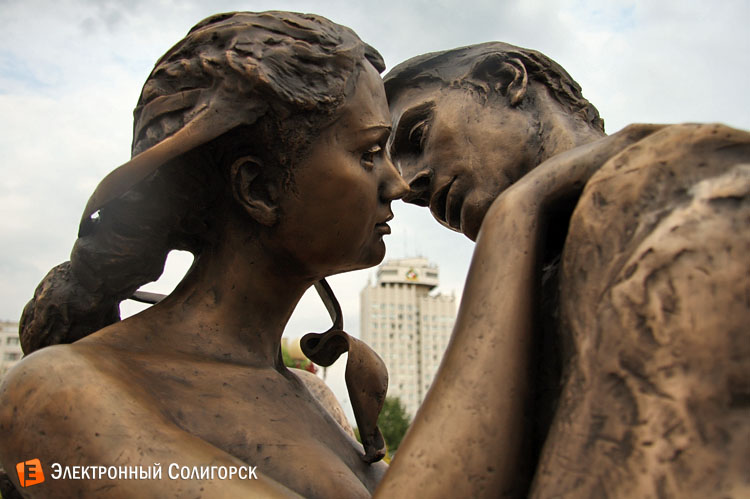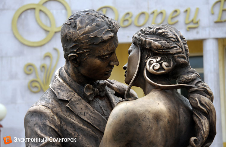 Почти двухметровая скульптура, изображающая близкие к поцелую объятия мужчины и женщины, накануне 55-летия Солигорска была установлена на площадке около Дворца бракосочетаний. Кстати, еще одним изменением в этом месте стал перенос декоративных лавочек, где молодожены оставляют замочки, по правую сторону от входа в ЗАГС. Такой ход только подчеркивает общую концепцию композиции - бронзовая пара словно только что встала со скамеек и, сделав несколько шагов, заключила нежные объятия.