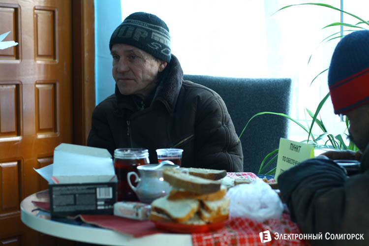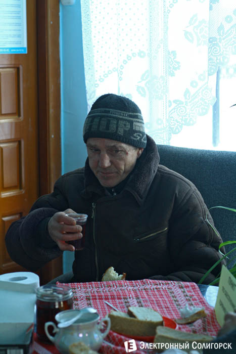 Тем временем к трапезе за столом присоединяется еще один зашедший мужчина в годах - Владимир Владимирович. Известно, что судьба полна событий: сидел в местах лишения свободы, жил в Сибири... Однако теперь даже не может вспомнить свое последнее место работы. Сегодня, по словам изучивших его суточный график сотрудников Центра, это не последний его заход, зайдет перекусить и после обеда. Съесть бутерброд и выпить чаю в тепле - это минутки радости в непростой жизни этого человека