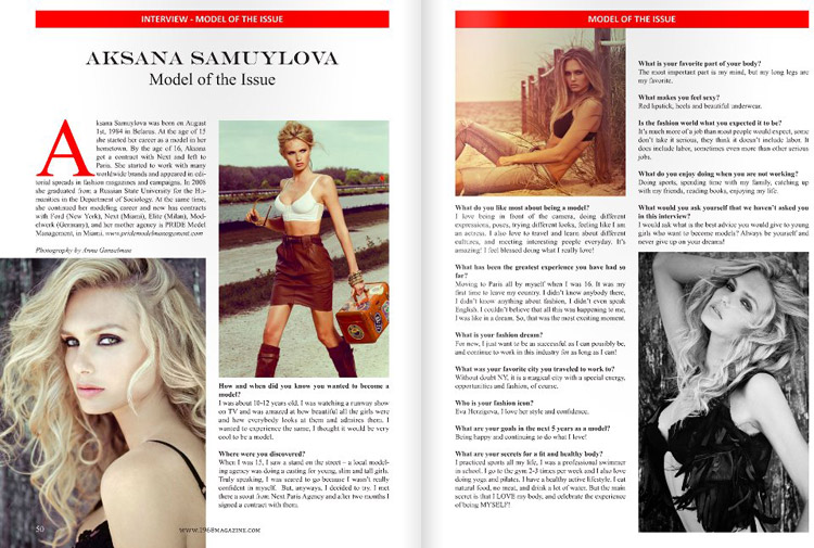 Прошли годы… Обычная солигорская девочка Оксана САМУЙЛОВА превратилась в роскошную диву, живущую в Майами, сотрудничающую с крупными модельными агентствами с разных континентов. Теперь она - Aksana Samy, кумир для многих и лицо многочисленных рекламных кампаний. Вы неоднократно видели ее в популярных рекламных роликах, на обложках журналов, в модных показах.