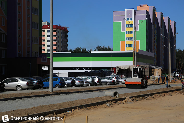 По соседству с этим ярким домом строится еще один знаковый объект - супермаркет "Родная сторона". В течение лета обещают открытие.