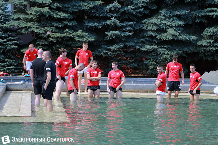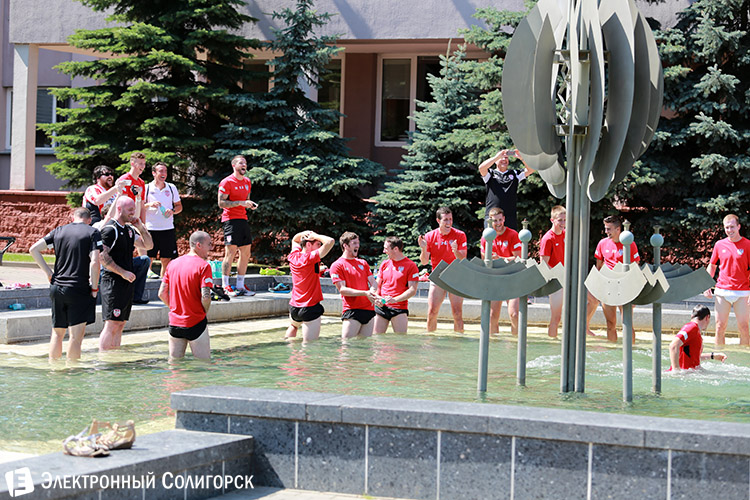Однако прежде, чем разойтись по номерам все футболисты сняли обувь и... зашли в фонтан, расположенный у здания управления ОАО "Беларуськалий". Под надзором тренеров они стояли в воде несколько минут. Как выяснилось, это была процедура релаксации спортсменов после тренировки в рамках подготовки к матчу с "Шахтером".