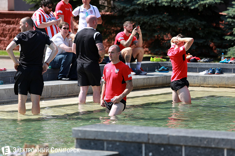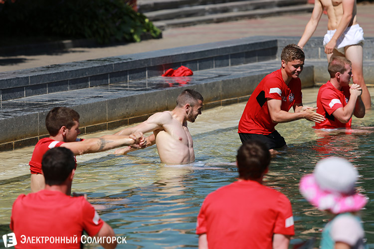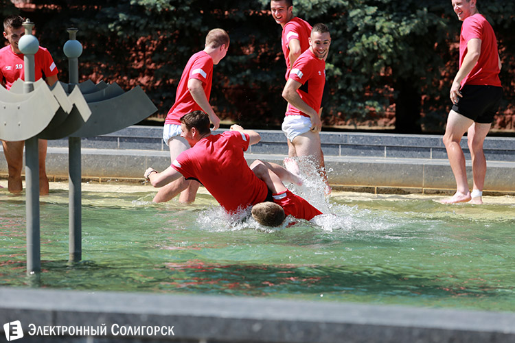 У приезжих футболистов явно было хорошее настроение, потому как вскоре процесс релаксации принял веселый оборот: обливания, брызги, смех... Кое-кому пришлось даже окунуться. Напомним, к слову, что солигорская санстанция не рекомендует купаться в городских фонтанах, где не производится циркуляция воды. Остается надеяться, что здоровью наших гостей после этого купания последствия не грозят:))
