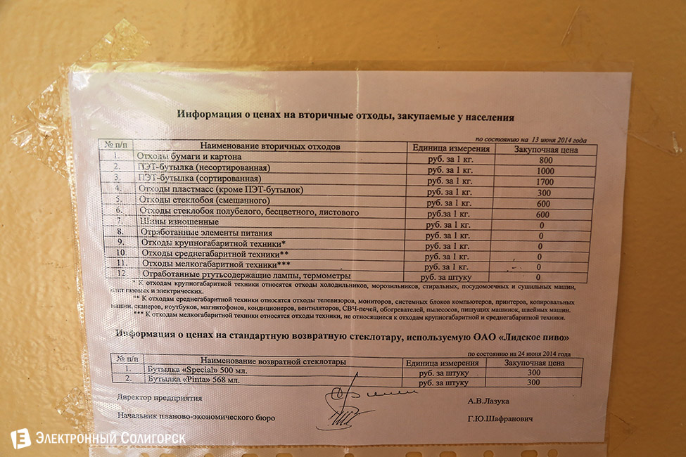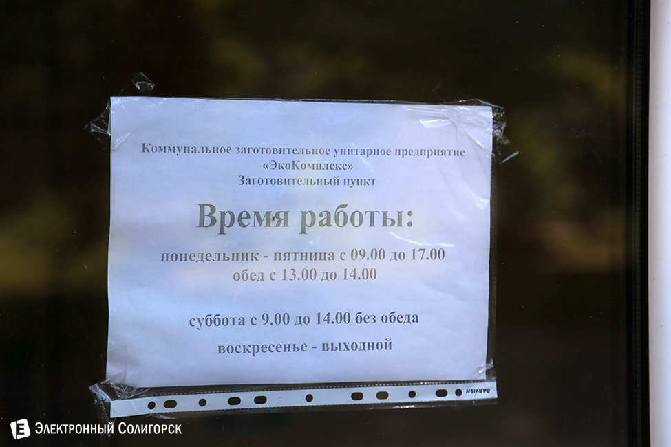 График работы пункта приема вторсырья на ул. Л. Комсомола, 33, в здание бывшего ЖЭС-3 (по соседству с кафе "Спатканне"): понедельник – пятница, с 10.00 до 18.00, обед с 13.00 до 14.00, в субботу - с 9.00 до 14.30, обед с 11.00 до 11.30.
