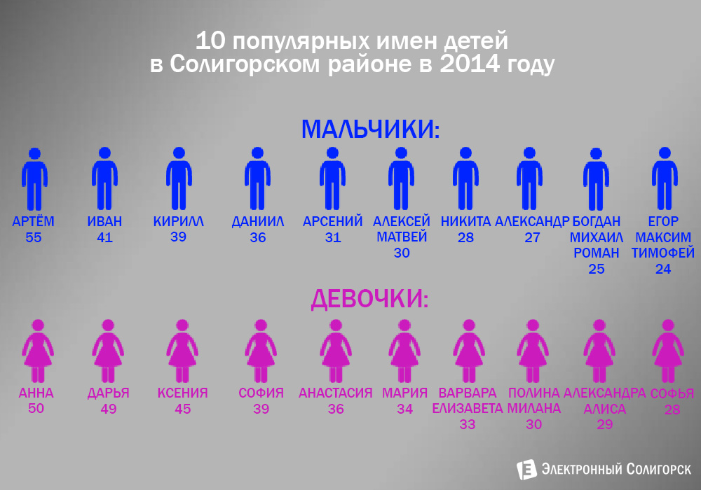 Ознакомиться подробнее с топом-10 популярных мужских и женских имён в Солигорском районе по итогам 2014 года можно в нижеприведённой инфографике.