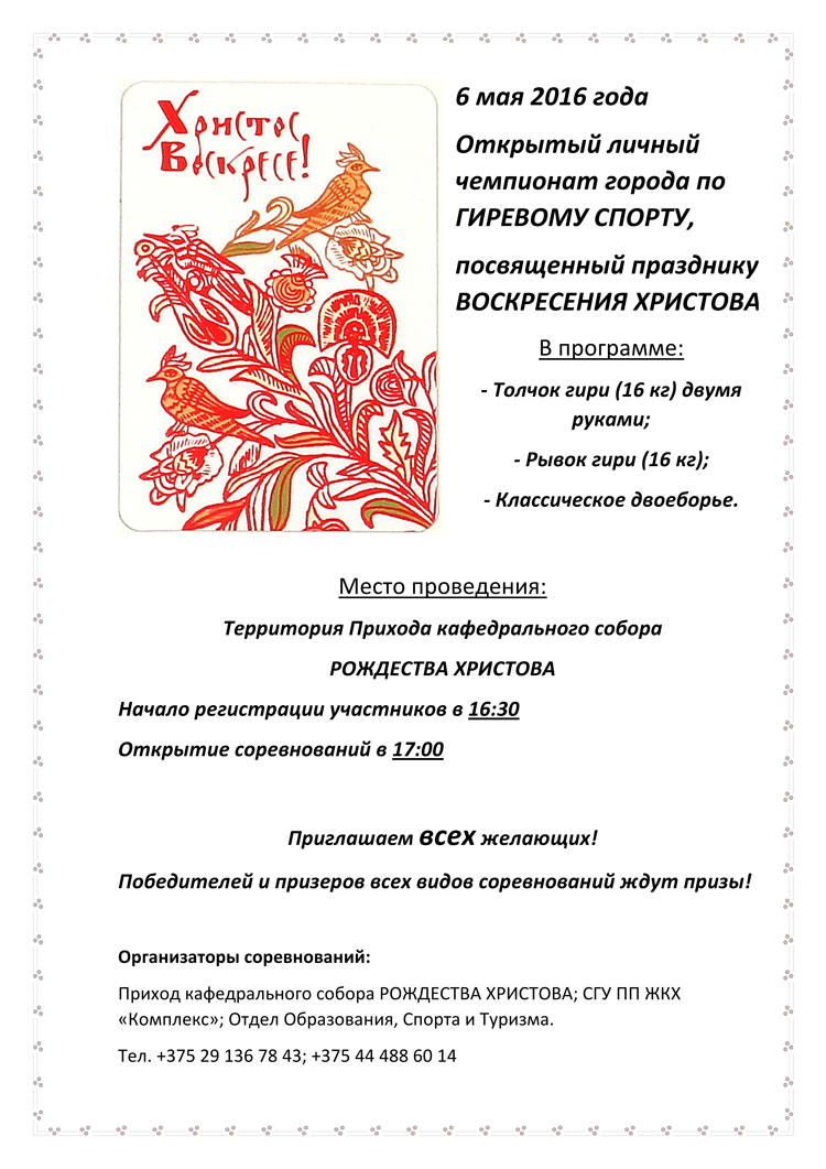 6 мая 2016 года в Солигорске пройдет открытый личный чемпионат города по гиревому спорту, посвященный празднику ВОСКРЕСЕНИЯ ХРИСТОВА