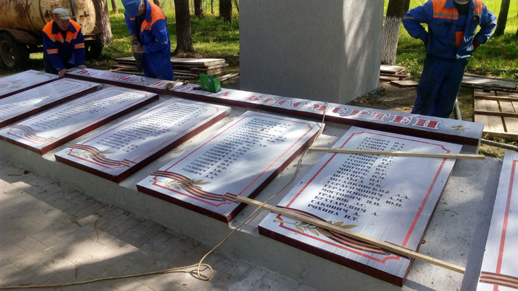 Больше работы было с памятником в д. Мозоли. Это скульптурное изображение двух воинов высотой около 6 метров, постамент которого требовал значительного обновления. Этим объектом занимались бригада штукатуров под началом Раисы Клезович и бригада маляров под руководством Аллы Михновец, которые многое сделали для декоративной отделки этого объекта. Хочу выразить особую благодарность художнику-оформителю ИВЦ стройтреста № 3 Андрею Моисеенко, который много труда вложил в надписи на металлических элементах памятника.