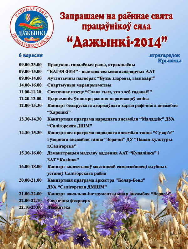 В агрогородке Кривичи сегодня проходит праздник тружеников села Солигорского района "Дажынкi-2014". С самого утра в Кривичах разместились торговые ряды, аттракционы для детей, начались выступления коллективов самодеятельности.