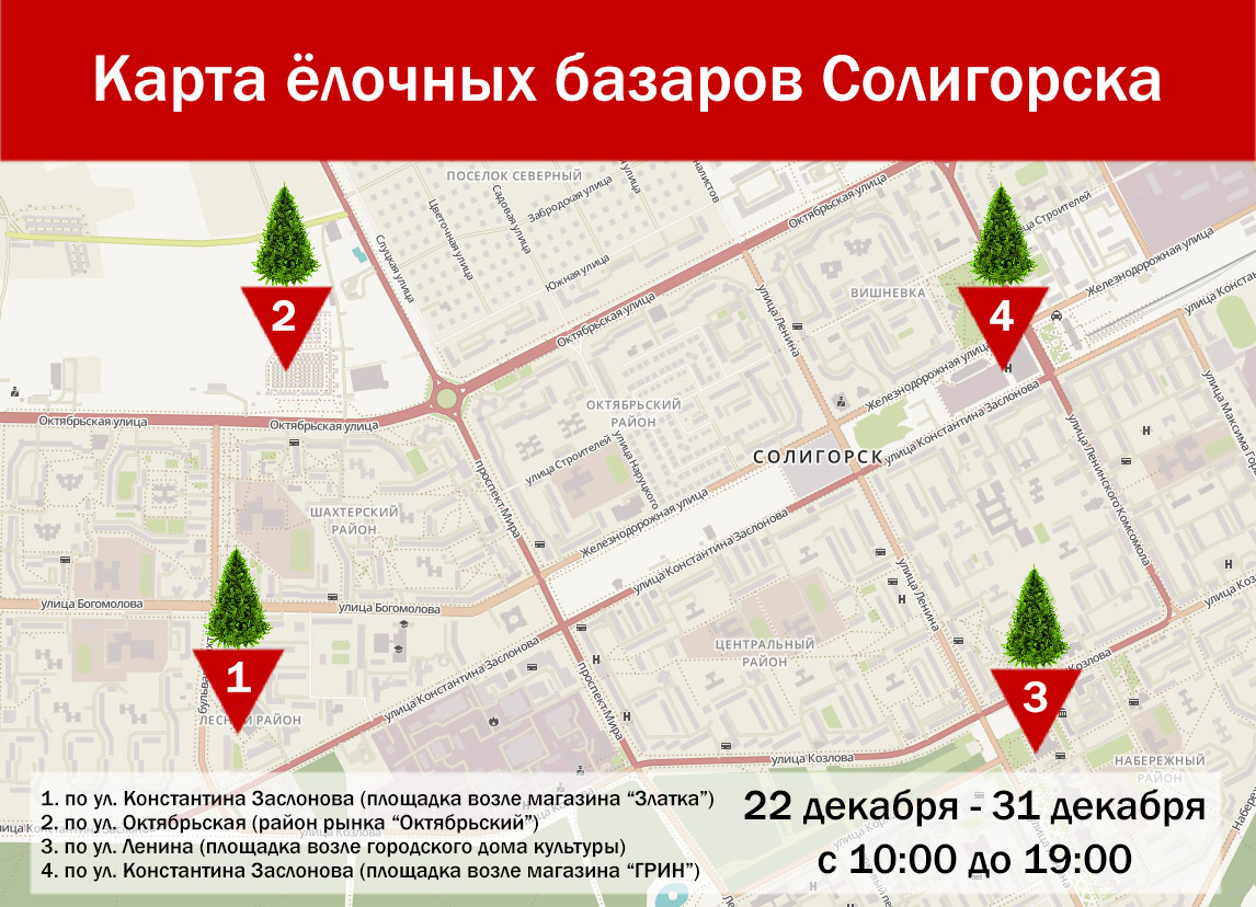 Новогодние деревья можно приобрести в следующих местах (см.карту):