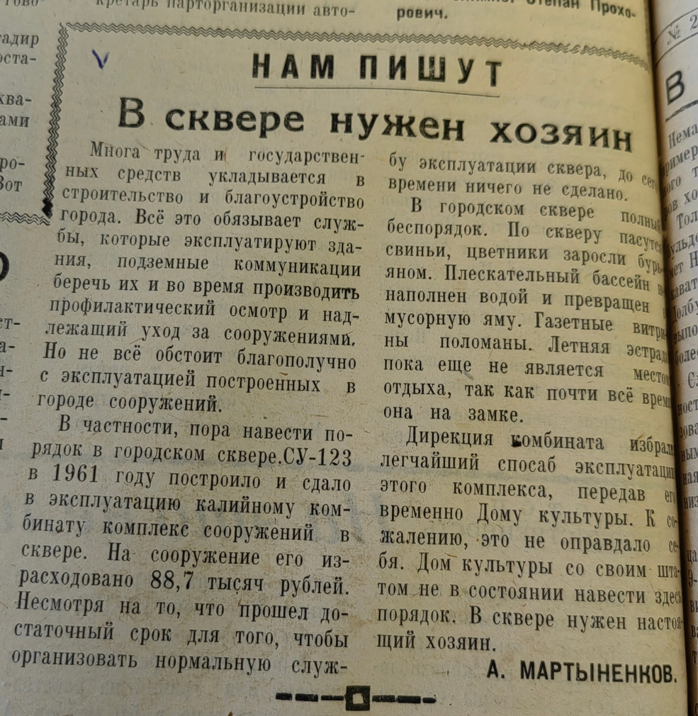 В частности, пора навести порядок в городском сквере. СУ-123 в 1961 году построило и сдало в эксплуатацию калийному комбинату комплекс сооружений в сквере. На сооружение его израсходовано 88,7 тысяч рублей.