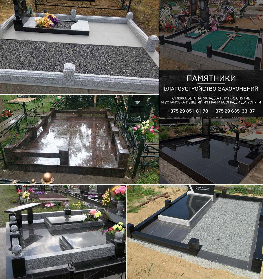 Осуществляют благоустройство мест захоронений (заливка фундамента, укладка плитки), установку и демонтаж, а также уборку мест захоронений.