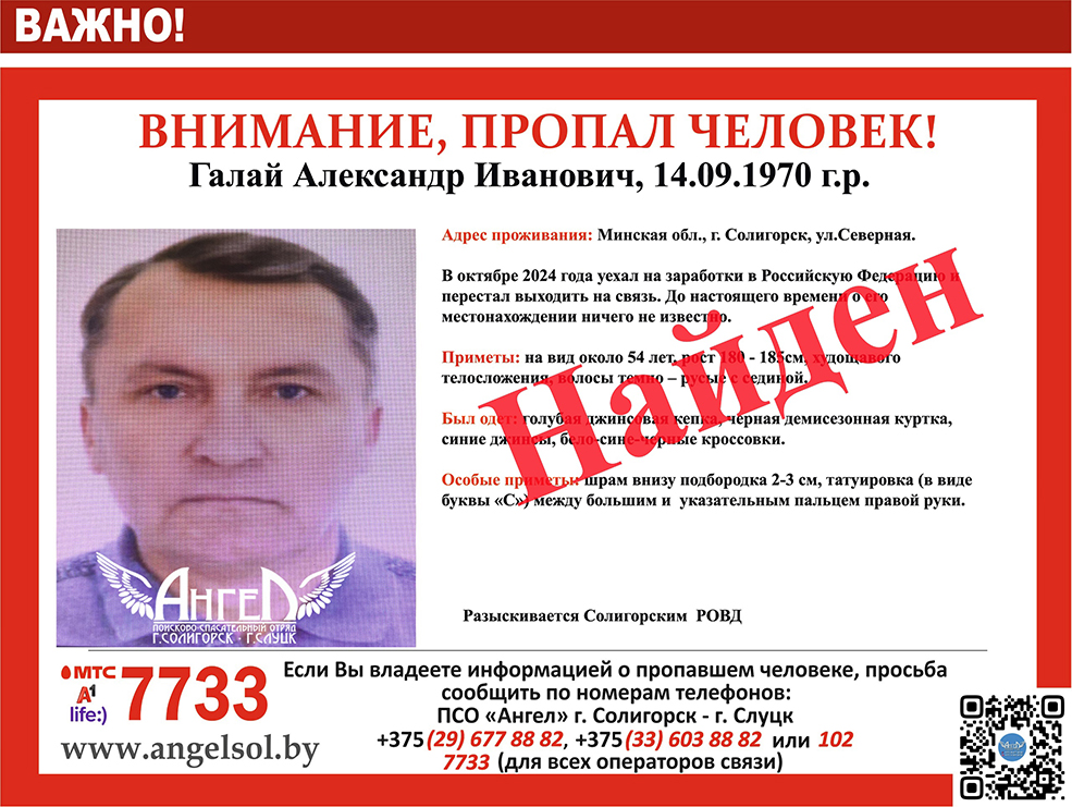 Как сообщили в ПСО "Ангел" г. Солигорск - г. Слуцк, Галай Александр Иванович (14.09.1970 г.р.) найден, жив. Найден сотрудниками милиции в г. Москва.