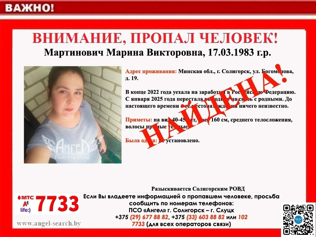Пропала Мартинович Марина Викторовна (17.03.1983 г. р.), проживающая по адресу: Минская обл., г. Солигорск, ул. Богомолова, д. 19.