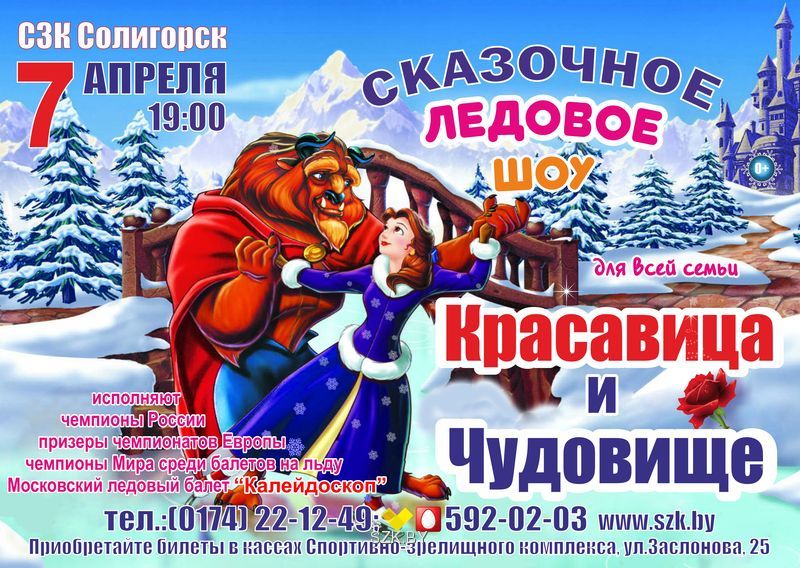 Сказочное ледовое шоу для всей семьи "Красавица и чудовщие" московского ледового балета "Калейдоскоп" состоится в Спортивно-зрелищном комплекс Солигорска 7 апреля, сообщает сайт СЗК.