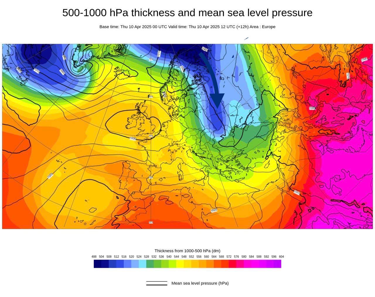 В Европе на востоке обосновалась высотная циклоническая ложбина, а на западе малоподвижный антициклон. Такая конфигурация приводит к формированию устойчивых северных потоков над нашим регионом и значительной отрицательной температурной аномалии. Об этом сообщает телеграм-канал Метеовайб.