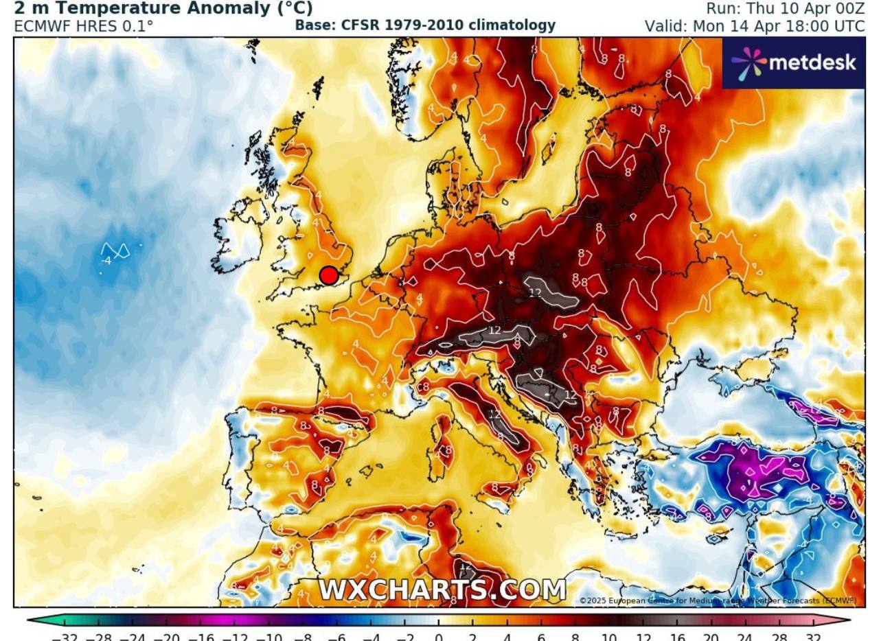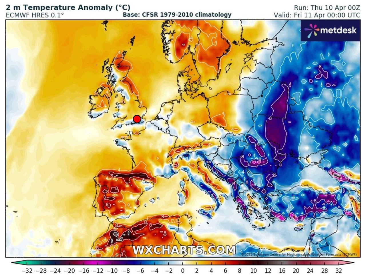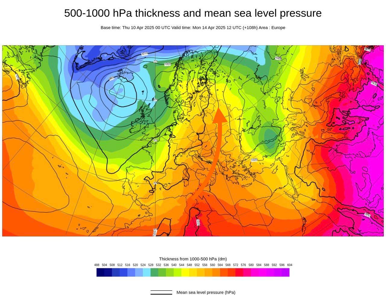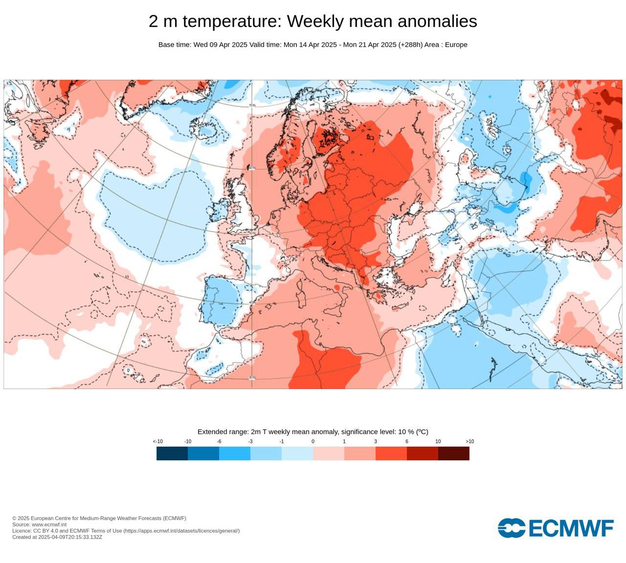 В результате устойчивые северные потоки переориентируются на юго-западные, что приведет к мощной адвекции тепла с севера Африки и районов Средиземноморья. Среднесуточные температуры значительно превысят норму, а на юго-западе дневные максимумы приблизятся к +20°С уже 13 апреля.