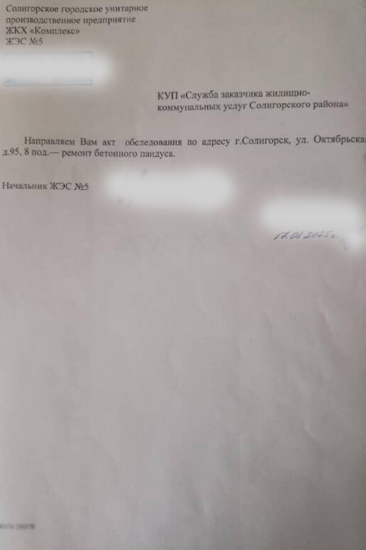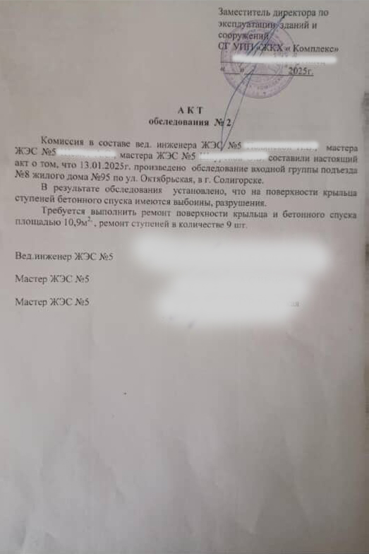 - Здравствуйте. Хочу осветить тему. Это касается не только нашего подъезда, а в целом такая проблема присутствует по всему городу. Октябрьская, 95, подъезд 8. Вечная наша головная боль - пандус. Уже с января жильцы подают заявки на реконструкцию, но всё остаётся без результата. Вся входная группа находится в плачевном состоянии. Мне спуститься с коляской просто травмоопасно в любое время года. Зимой всё превращается каток. Ступени разных размеров, всё скользкое и разбитое, угол наклона пандуса не подходит ни для чего: ни коляску детскую поднять, ни инвалидную.